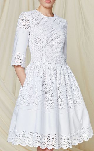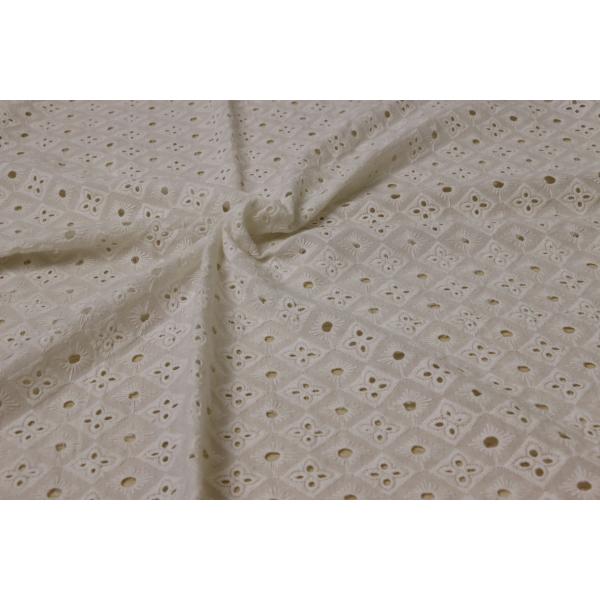 This white cotton fabric boasts gorgeous eyelet Geometric embroidery. Made of pure cotton, it is fabulously soft and breathable. Thin and translucent, it is perfect for graceful garments like summer dresses, tops, A-line skirts. Add a daring touch to your design project.